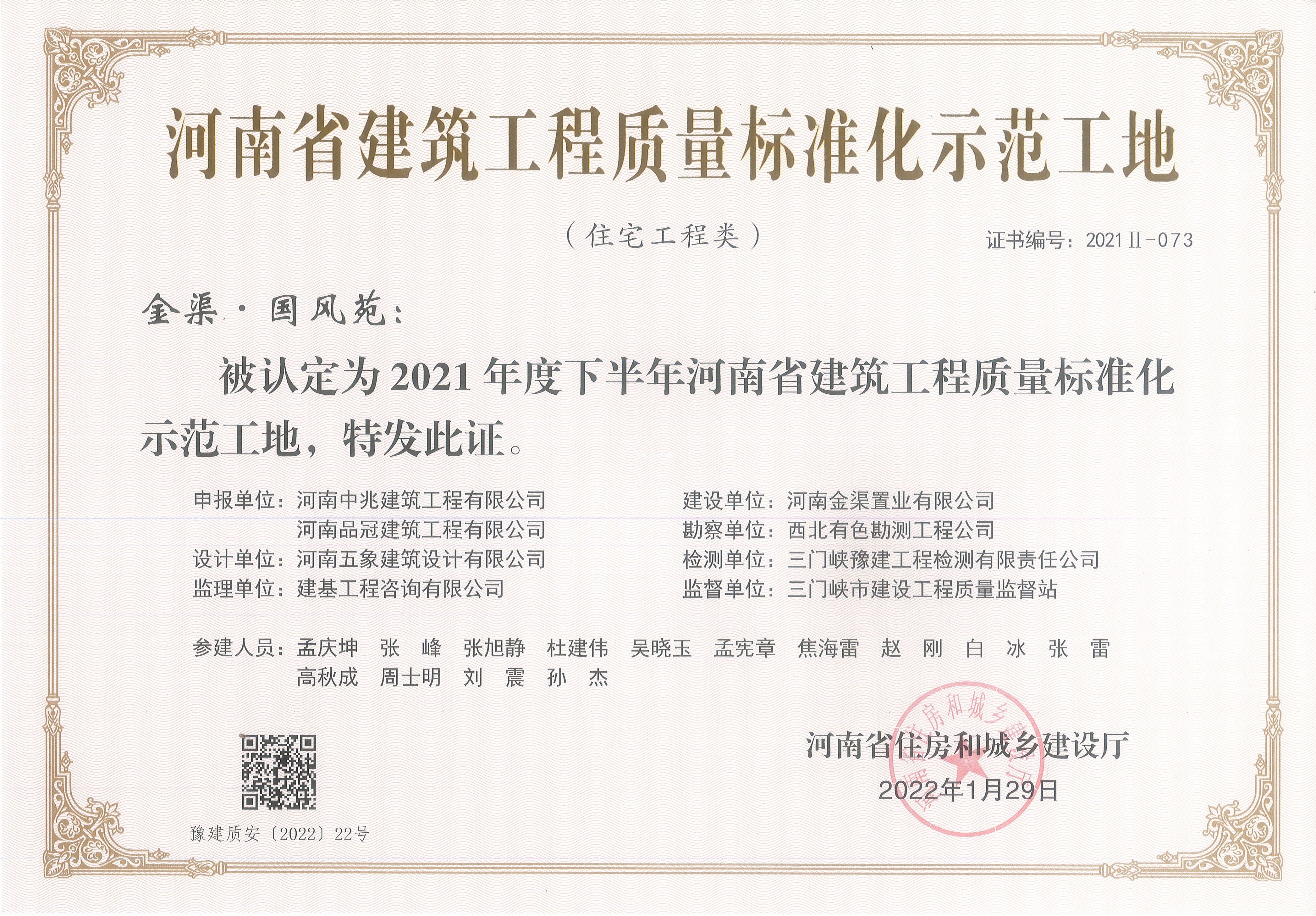 河南省建筑工程安全文標準化示范工地榮譽(德馨苑項目)